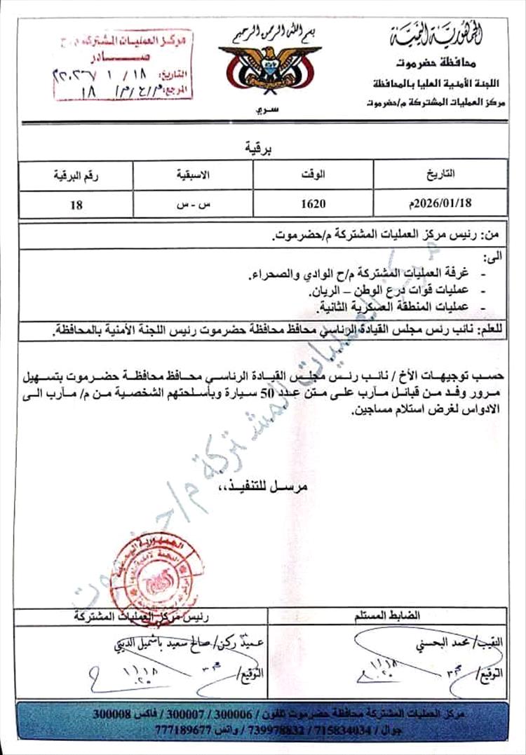 وحسب التعميم الموجه إلى عمليات الوادي والصحراء وقوات درع الوطن في الريان والمنطقة العسكرية الثانية، يتم السماح بدخول 50 طقم من قبائل مأرب بأسلحتهم الشخصية إلى منطقة الادواس في ساحل حضرموت، وذلك من أجل نقل مساجين.