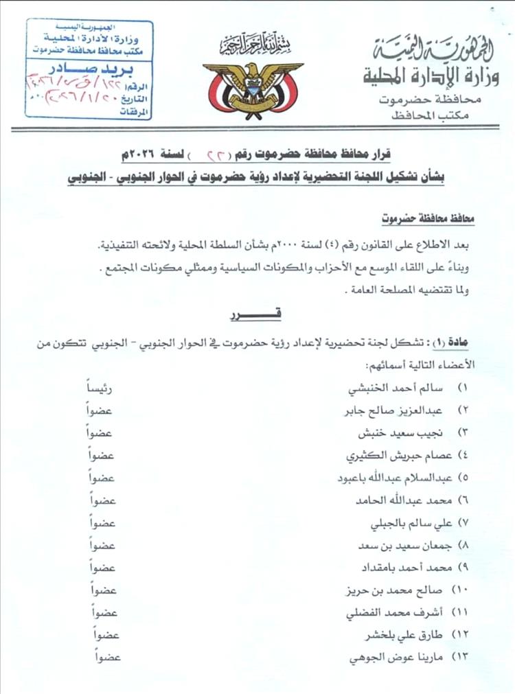 أثار القرار الصادر عن عضو مجلس القيادة الرئاسي ومحافظ حضرموت، سالم الخنبشي، بشأن تشكيل لجنة تحضيرية لإعداد "رؤية حضرموت" للمشاركة في حوار الرياض، موجة من التشكيك والرفض في الأوساط السياسية والمجتمعية بالمحافظة.