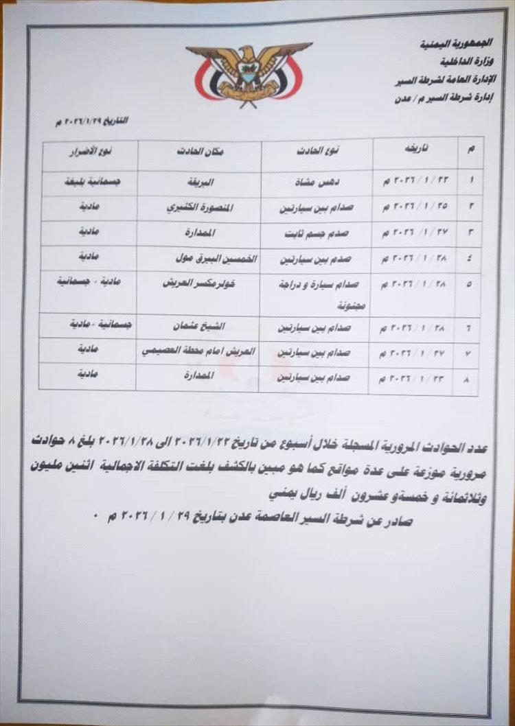 سجلت إدارة شرطة السير في العاصمة عدن (4,784) مخالفة مرورية إلى جانب 8 حوادث مرورية خلال أسبوع واحد وذلك في الفترة الممتدة من 22 إلى 28 يناير 2026م وفقًا للتقارير الرسمية الصادرة عن الإدارة.