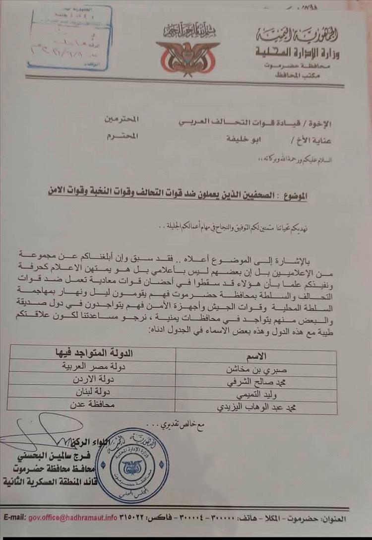 أثارت وثيقة مسربة تحمل توقيع وختم محافظ حضرموت السابق، اللواء الركن فرج سالمين البحسني، موجة غضب واسعة في الأوساط الصحفية والحقوقية، بعد كشفها عن مراسلات رسمية وجهها البحسني إلى قيادة قوات التحالف العربي يطالب فيها بالتحرك ضد مجموعة من الصحفيين والإعلاميين بدعوى "العمل ضد قوات التحالف والنخبة وقوات الأمن".