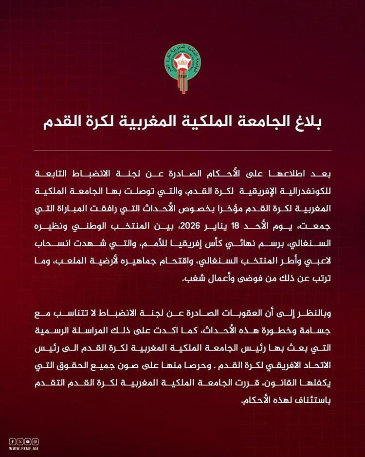 وجاء في بيان نشره الاتحاد المغربي على حسابه في منصة "إكس" اليوم الثلاثاء: "بعد اطلاعها (الجامعة الملكية المغربية لكرة القدم) على الأحكام الصادرة عن لجنة الانضباط التابعة للكونفدرالية الإفريقية لكرة القدم، والتي توصلت بها الجامعة الملكية المغربية لكرة القدم مؤخرا بخصوص الأحداث التي رافقت المباراة التي جمعت يوم الأحد 18 يناير 2026، بين المنتخب الوطني ونظيره السنغالي، برسم نهائي كأس أمم إفريقيا، والتي شهدت انسحاب لاعبي وأطر المنتخب السنغالي، واقتحام جماهيره لأرضية الملعب، وما ترتب عن ذلك من فوضى وأعمال شغب".