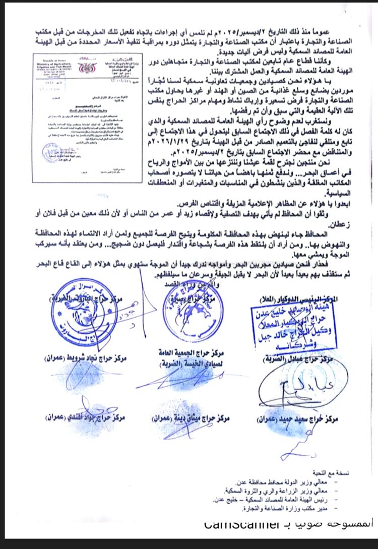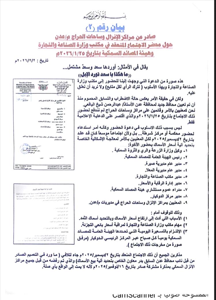 أصدرت مراكز الإنزال السمكي وساحات الحراج في العاصمة عدن بياناً شديد اللهجة (البيان رقم 2)، أعلنت فيه رفضها القاطع لما أسمته "التدخلات غير المدروسة" في القطاع السمكي، منتقدةً الآليات التي يحاول مكتب وزارة الصناعة والتجارة وهيئة المصائد السمكية فرضها لتحديد أسعار الأسماك.