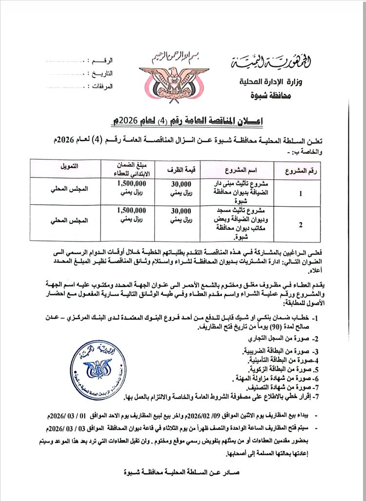 وشددت السلطة المحلية على ضرورة التزام جميع المتقدمين بالشروط الفنية والقانونية المعتمدة، وتقديم العطاءات وفق الإجراءات المحددة، مؤكدة حرصها على تكريس مبادئ الشفافية والتنافس العادل، وتنفيذ مشاريع نوعية تسهم في تعزيز الاستقرار الإداري والخدمي بمحافظة شبوة