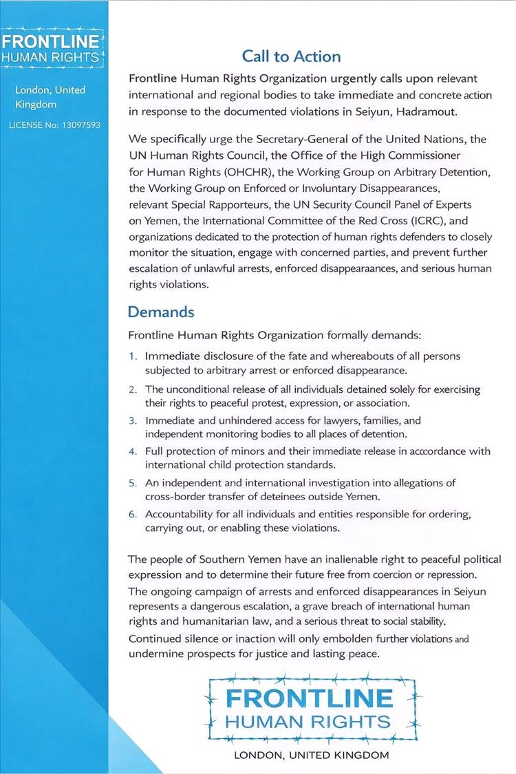 قدّمت منظمة فرونت لاين البريطانية لحقوق الإنسان من مقرها بلندن نداءً قانونيًا وحقوقيًا عاجلًا بشأن انتهاكات جسيمة شهدتها مدينة سيئون بمحافظة حضرموت، جنوب اليمن، عقب تظاهرات سلمية واسعة خرج فيها عشرات آلاف المواطنين دعمًا للمجلس الانتقالي الجنوبي ورفضًا للترتيبات السياسية والأمنية المفروضة من قبل المملكة العربية السعودية.