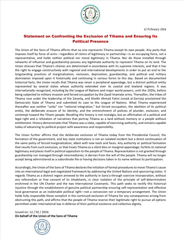 كما حمّل البيان الأطراف المتواطئة مع استمرار إقصاء تهامة كامل المسؤولية عن أي تداعيات قد تترتب على تعطيل هذا المسار، مؤكدًا أن أبناء تهامة يحتفظون بحقهم المشروع في اعتماد كل الخيارات التي يكفلها القانون الدولي دفاعًا عن وجودهم السياسي وكرامتهم الجماعية.