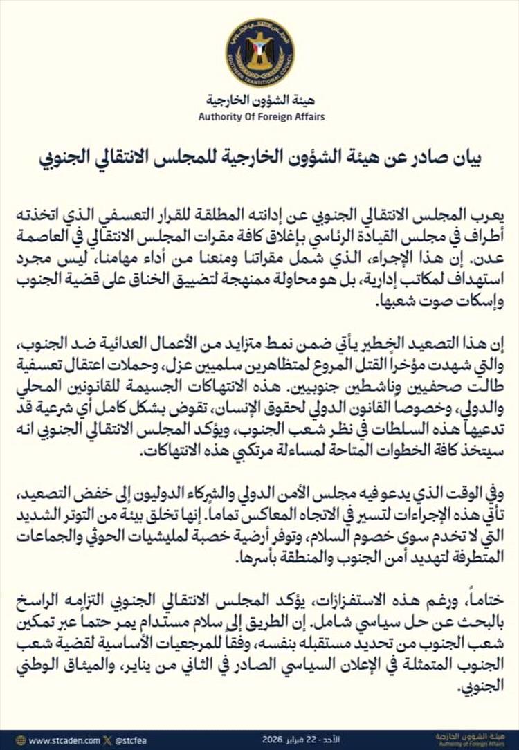 وأضاف البيان أن الخطوة تأتي ضمن ما وصفه بـ"نمط متزايد من الأعمال العدائية ضد الجنوب"، متحدثًا عن سقوط قتلى وجرحى في احتجاجات سابقة، إضافة إلى حملات اعتقال طالت صحفيين وناشطين.