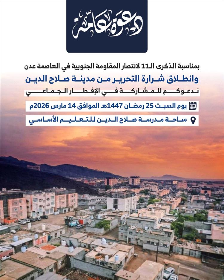 وفي مشهد يعكس الوفاء لأرض البدايات، أعلن أبناء مدينة صلاح الدين بمديرية البريقة — وهي المنطقة التي انطلقت منها شرارة التحرير الأولى — عن دعوة عامة لإفطار جماعي مهيب سيقام في ساحة مدرسة صلاح الدين للتعليم الأساسي، وذلك يوم السبت الموافق 25 رمضان 1447هـ (14 مارس 2026م)، وأكد المنظمون أن هذا التجمع يأتي كرسالة وفاء وعرفان لدماء الشهداء الأبرار الذين سطروا ببطولاتهم ملاحم يوم التحرير العظيم، واستحضاراً لتضحيات شباب المدينة الذين قدموا أرواحهم رخيصة دفاعاً عن الأرض والعرض والكرامة، لتظل صلاح الدين دائماً عنواناً ثابتاً للصمود والبطولة.