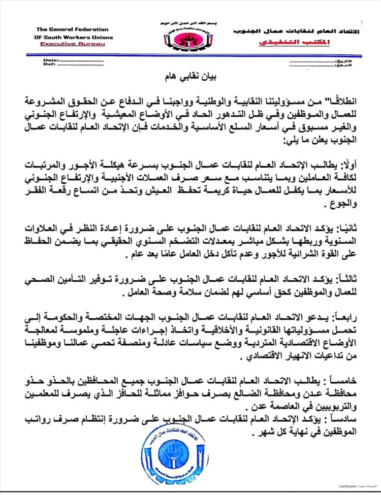 أصدر الإتحاد العام لنقابات عمال الجنوب "بيان نقابي هام" تلقت عدن تايم نسخة منه :