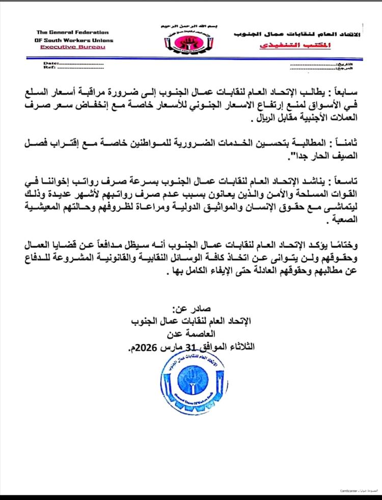 سابعٱ : يطالب الإتحاد العام لنقابات عمال الجنوب إلى ضرورة مراقبة أسعار السلع في الأسواق لمنع إرتفاع الاسعار الجنوني للأسعار خاصة مع إنخفاض سعر صرف العملات الأجنبية مقابل الريال .