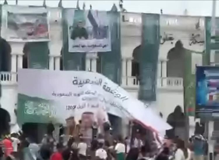 وبعد دقائق من انطلاق الفعالية التي رفعت فيها صور رئيس مجلس القيادة رشاد العليمي وعضو مجلس القيادة سالم الخنبشي، وقادة السعودية، والإعلام اليمني والسعودي، تقدمت حشود ترفع أعلام الجنوب تجاه مكان الفعالية وهي تهتف للجنوب وقضيته.
