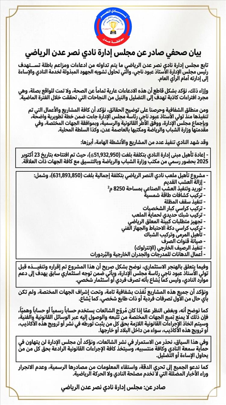 تابع مجلس إدارة نادي نصر عدن الرياضي ما يتم تداوله من ادعاءات ومزاعم باطلة تستهدف رئيس مجلس الإدارة الأستاذ عبود ناجي، والتي تحاول تشويه الجهود المبذولة لخدمة النادي والإساءة إلى إدارته أمام الرأي العام.