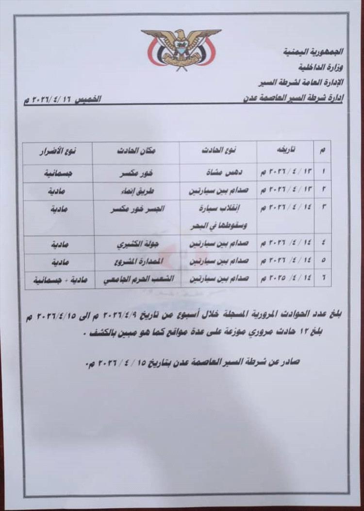 وبلغ عدد الحوادث المرورية (6) حوادث في مواقع متفرقة، نتج عنها أضرار مادية وإصابات طفيفة، حيث تجاوزت الخسائر (2,200,000) ريال يمني. كما تم ترقيم (190) سيارة خلال نفس الفترة ضمن أعمال تنظيم وتحديث بيانات المركبات.