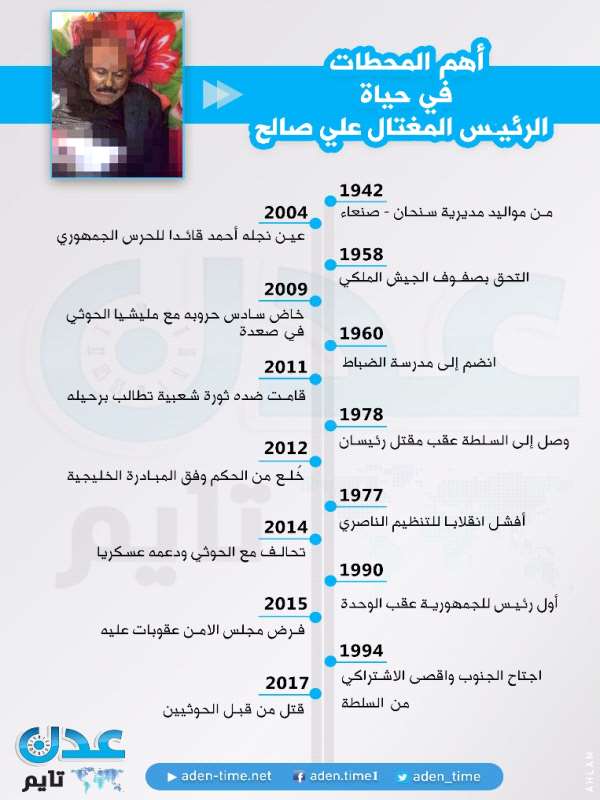 أنفوجرافيك عدن تايم: أهم المحطات في حياة الرئيس المغتال علي صالح