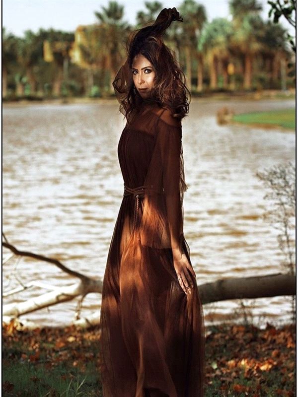 وارتدت "منى"، فستان بنى بأكمام شفافة من الشيفون، وبحبل عند الوسط اختارته لها الاستايلست ياسمين عيسى.