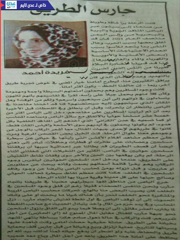 ونشرت الكتابة فريدة احمد مقال أوردت فيه قصة صادمة لسماح نقطة تابعة للجيش الوطني لمسلحي الحوثي بالعبور منها إلى جبهة القتال مقابل مبلغ مالي كبير.