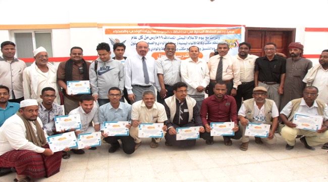 وفي الحفل التكريمي و الختامي للدورة ناشد وكيل محافظة حضرموت المساعد لشؤون مديريات حضرموت الوادي والصحراء الاخ / عبد الهادي عبداللاه التميمي الصحفيين بان يكونوا المرأة العاكسة بين المواطن والسلطة والعكس وبكل شفافية والناقل للمعلومة الدقيقة والصحيحة بشكل مهني للأحداث الجارية كل في مديريته وبدون مزايدة وتلميع والاسهام في عملية التنمية