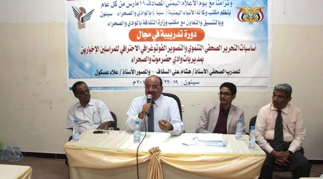 واختتام الدورة التدريبية في مجال ( أساسيات التحرير الصحفي التنموي والتصوير الفوتوغرافي الاحترافي ) التي نظمها مكتب سيئون لوكالة الأنباء اليمنية سبأ بحضرموت الوادي والصحراء بالتعاون مع مكتب الثقافة بحضرموت الوادي والصحراء بتمويل من السلطة المحلية بالوادي والصحراء وهدفت إلى إكساب 26 مشاركا من مديريات حضرموت الوادي معلومات ومعارف ومهارات تساعدهم في تحسين جودة أدائهم بمهنية واحترافية والارتقاء بأدائهم في تغطية أخبار الأنشطة والفعاليات التنموية بمديرياتهم من قبل مدربي الدورة المدير الأسبق لمكتب وكالة سبأ بسيئون الأخ الصحفي / هشام علي السقاف و المصور العالمي / علاء عسكول .