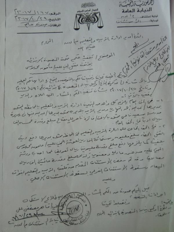 ورغم صور حكم ابتدائي وتعزيزه من محكمة استئناف محافظة عدن، بتاريخ ٣٠ مارس ٢٠١٤م،والذي قضى بدفع مبلغ ٣٨٠٠٠٠٠ ثلاثة مليون وثمان مائة ألف ريال، دية للقتل الخطأ وتعويض لأسرة القتيل، إلا أن الحكم لم ينفذ حتى اللحظة، رغم توجيه رئيس نيابة استئناف عدن، في أكتوبر ٢٠١٧، مذكرة الى مدير التربية والتعليم في عدن، لاستكمال إجراءات التنفيذ.