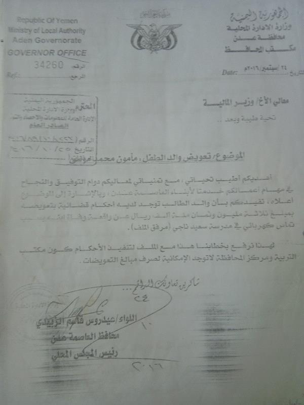 وكان مكتب محافظ عدن وجه مذكرة في سبتمبر ٢٠١٦ لوزير المالية لصرف المبلغ، كون المحافظة والتربية لا توجد لديهم إمكانية لصرفه، ومازالت عشرات المذكرات التي يكتظ بها الملف حبر على ورق.