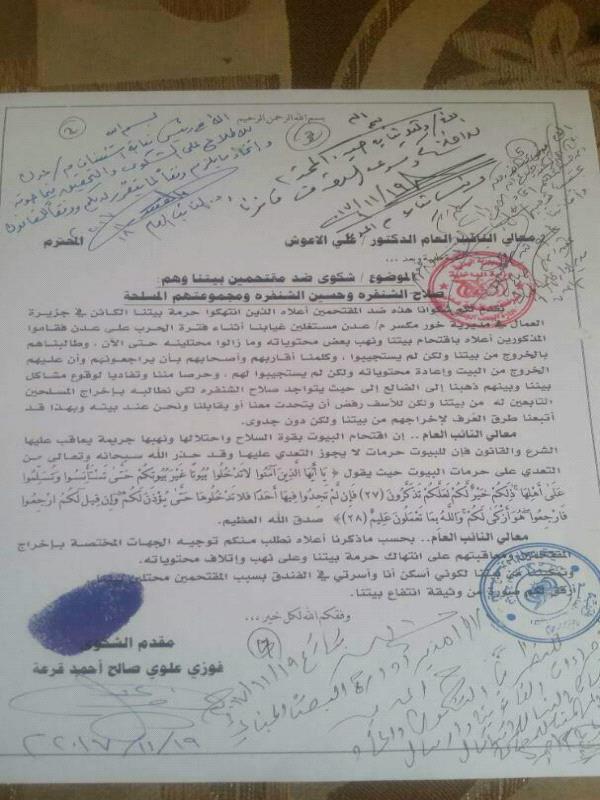 شكا المواطن فوزي علوي قرعه من قيام عضو مجلس النواب صلاح الشنفرة بالسطو على فلة له تقع في جزيرة العمال بمديرية خور مكسر .