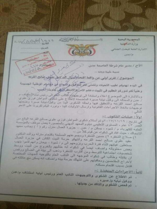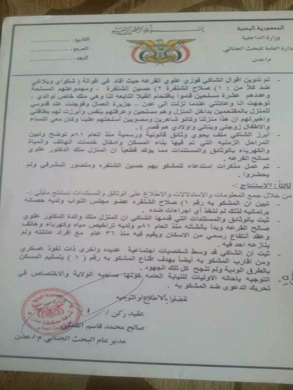بالوثائق .. مواطن جنوبي يشكو بسط القيادي صلاح الشنفرة على فلته مستغلا الحصانة البرلمانية