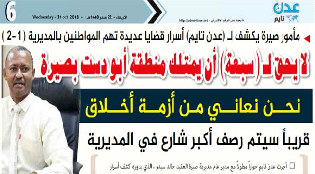 كشف مدير عام مديرية صيرة بعدن في حوار مطول لـ "عدن تايم" ينشر على جزئين في الصحيفة ، عن معلومات وأسرار عديد من القضايا التي تهم المواطنين وخاصة أبناء وأهالي مديرية كريتر .