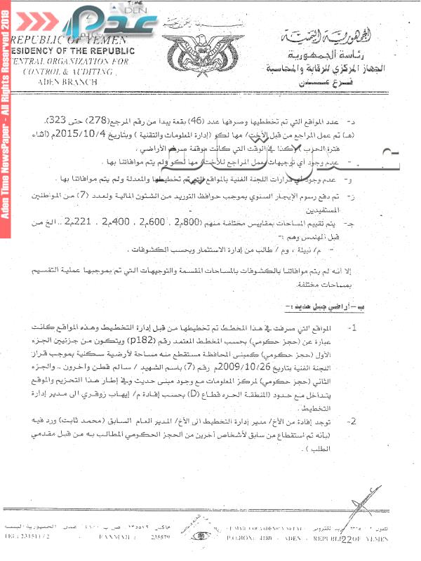 الجهاز المركزي يرى انه عند الإطلاع على قرارات الأخ/ محمد ثابت مدير عام الأراضي م / عدن الخاص بقرار الإلغاء يدرك عدم الإحساس بالمسئولية وانها مجرد قرارات لا ترتقي ألى حجم الاضرار الذي خلفته عملية صرف محاضر تسليم المواقع للمذكورين بمساحة قدرها (162) فدان في البلوكات 2 ، 3 ، 4 والمصروفة من سابق للمواطنين وبعقود رسمية.