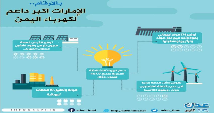 ففي عدن عملت دول الإمارات على توفير 127مولد كهربائي بقوة واحد ميجا لكل مولد ، ومن ضمنها محطة ملعب 22مايو ، ومحطة أخرى في عدن ، وكذلك 10مولدات في محطة حجيف بالتواهي ، كما تكفلة الإمارات لتأهيل وصيانة اربع محطات ، دفع مرتبات موظفي مؤسسة كهرباء عدن لمدة ثلاثة اشهر عقب تحرير عدن ، بالاضافة لتوفير عشرات الآلاف من الوقود للمحطات في المحافظة.