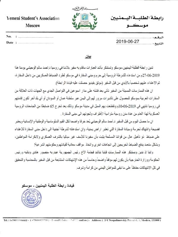 استنكرت قيادة رابطة الطلاب اليمنيين بموسكو قيام السفير د.احمد سالم الوحيشي باستدعاء الشرطة الروسية لإخراج ضباط يمنيين خريجين من داخل مبنى السفارة.
