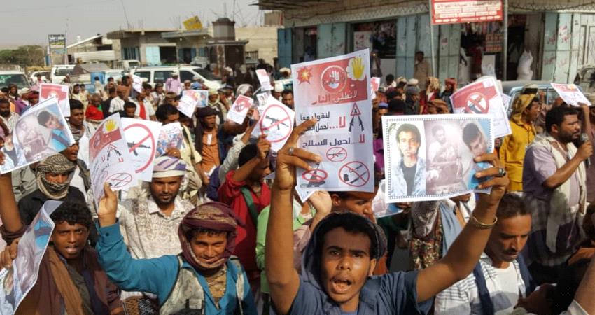 الجماهير التي خرجت في مسيرة جماهيرية جابت الشارع العام المحفد هتف ورفع خلالها المشاركون بالشعارات المطالبة بمنع حمل السلاح في سوق المديرية .