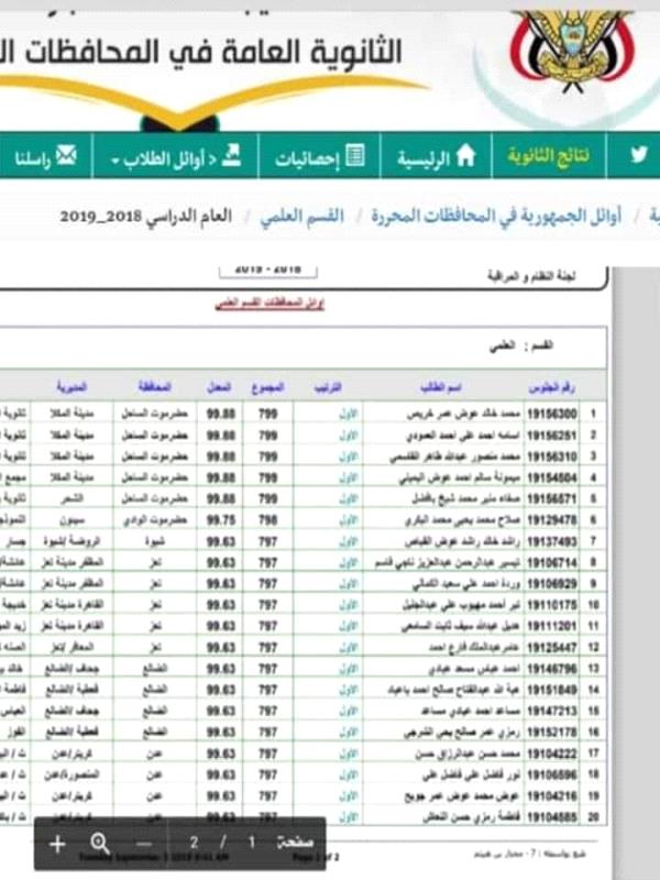 اظهرت نتائج امتحانات شهادة الثانوية العامة للعام الدراسي 2018/2019 المراكز الاولى التي احرزها الطلاب في المحافظات المحررة.